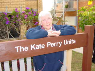 On the 25 June 2002, founding member, Kate Perry, was honoured with the naming of an housing complex in her name at Pickering & Hurdcotte Streets, Enoggera. Kate Perry outside the units complex. Within hours of this photograph being taken Kate was in hospital for a scheduled major heart operation. |